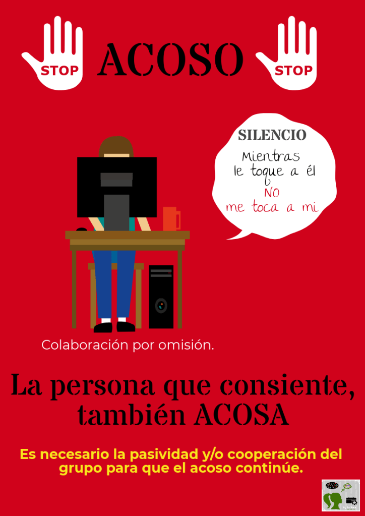 Cuando ya tiene apoyos y llamo apoyos también a l@s compañer@s que “pasan” literalmente de la situación o que hacen como que no existe o te la reconocen por detrás, pero no hacen nada o que te dicen que son imaginaciones tuyas o que a ellos no les pasa por lo que no es cosa suya… Colaboración por omisión , si, pero colaboración. Y ahí está la clave, porque la situación se perpetúa por su pasividad.