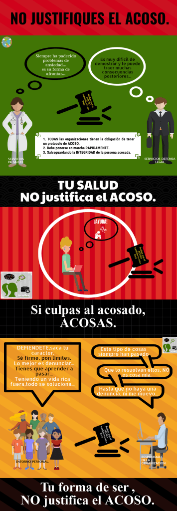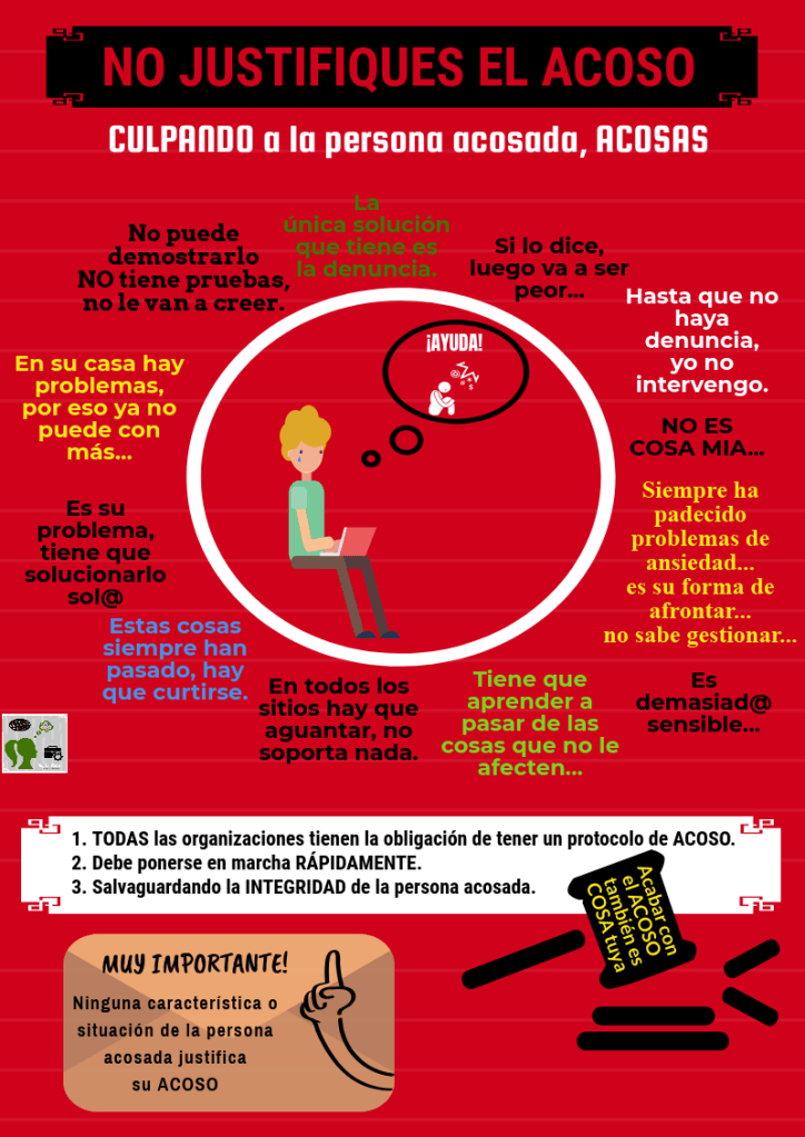Además te encontrarás con que siempre intentan echarte la culpa a ti. “Es que no dijiste”, “es que dijiste”, “es que no hiciste”, “es que hiciste”, “es que eres así”, “es que no eres así”… ¿perdón? A ti te han maltratado y tu eres la víctima, encima ¿tú tienes la culpa?¿tu eres la persona que tiene que abandonar tu puesto de trabajo? ¿tu eres a la persona que acaban echando?