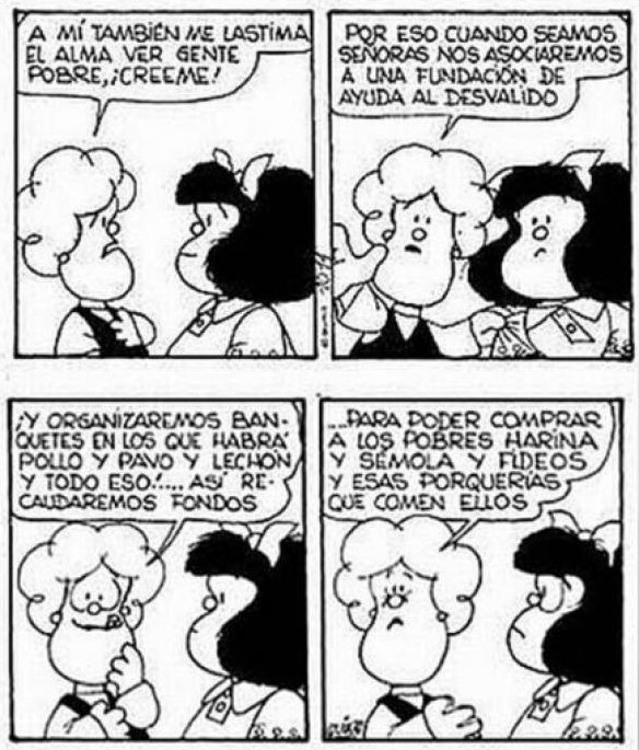 Los efectos de la caridad en las personas son demoledoras, solventan puntualmente una necesidad física, pero a la persona le destruye su autoestima, le hace sentir culpable por no poder lograr por sí mism@ lo que le están teniendo que DAR, genera sensación de deuda porque le están dando algo DE otr@s, genera dependencia y cronicidad porque no creen que puedan salir por si mim@s de la rueda de la pobreza, paraliza, acrecienta las desigualdades ya que cada persona (la que da y la que recibe) ve reforzada su posición social y se transmite que no está en su mano modificarla, destroza la dignidad … cuando en realidad est@s ciudadan@s tienen derecho reconocido a tener sus necesidades cubiertas sin la «CARIDAD, BENEFICENCIA, ASISTENCIALISMO» de nadie (a la par que fomentar su autonomía y empeoramiento para que no dependan de las instituciones o caridad). Es suyo por derecho y no lo digo yo, es que así lo reconoce LA CONSTITUCIÓN ESPAÑOLA. Y como ya hemos visto, ha costado mucho y a muchas personas a lo largo de la historia, llegar a este punto que parece no tenemos aún claro ¡ni los responsables políticos! (Algun@s andan pidiendo limosna, mediante el chantaje emocional que eso supone, a la población abriendo cuentas bancarias…)
